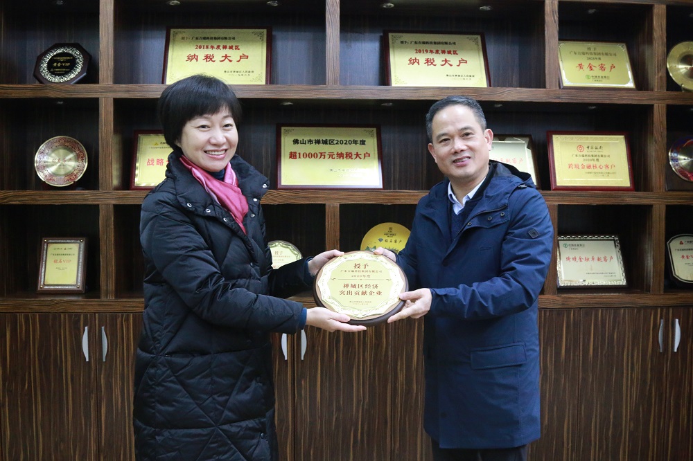 2月23日上午,禅城区经济和科技促进局副局长张楠一行到访吉瑞公司,向吉瑞公司颁发“2020年度禅城区经济突出贡献企业”奖牌,副总裁张胜、行政副总经理戴学军给予了热情接待。