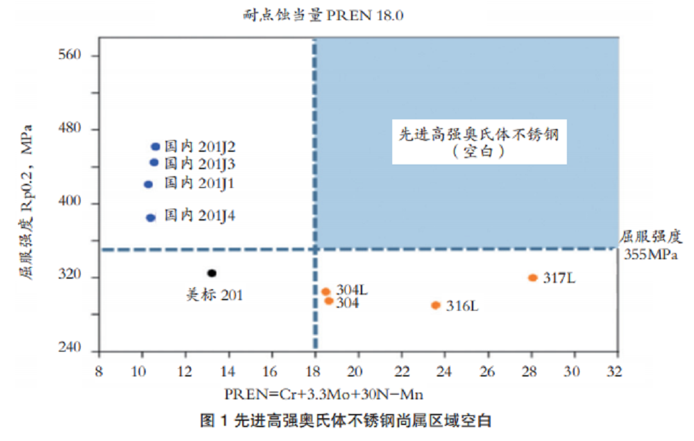 在长达百年的不锈钢发展历程中,以304和316L为代表的铬镍系不锈钢屈服强度只有300MPa左右,在承载结构等领域需加厚使用,高昂的合金成本难以在承载结构领域推广,碳排放也高。近几十年来,国内外已产业化了14%Cr-1%Ni和16%Cr-4%Ni两大类节镍奥氏体不锈钢,其屈服强度提升,但耐点蚀当量PREN(%Cr+3.3(%Mo)+30(%N)-Mn)值低于16.0,耐蚀性远不如304不锈钢,使用寿命短,只能在干燥地区以及室内装饰等场景使用。为此,室外承载结构领域市场亟需耐蚀性良好的高强奥氏体不锈钢,也即先进高强奥氏体不锈钢(图1)。