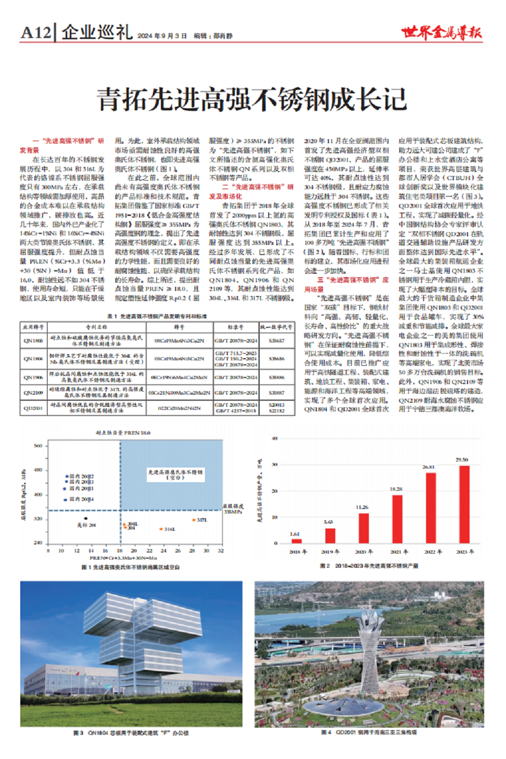 青拓集团于2018年全球首发了2000ppm以上氮的高强奥氏体不锈钢QN1803,其耐蚀性达到304不锈钢级,屈服强度达到355MPa以上。经过多年发展,已形成了不同耐点蚀当量的先进高强奥氏体不锈钢系列化产品,如QN1804、QN1906和QN 2109等,其耐点蚀性能达到304L、316L和317L不锈钢级。2020年11月在全亚洲范围内首发了先进高强经济型双相不锈钢QD2001,产品的屈服强度在450MPa以上,延伸率可达40%,其耐点蚀性达到304不锈钢级,且耐应力腐蚀能力远胜于304不锈钢。这些高强度不锈钢已形成了相关发明专利授权及国标(表1)。从2018年至2024年7月,青拓集团已累计生产和应用了100多万吨“先进高强不锈钢”(图2)。随着国标、行标和团标的建立,其市场化应用进程会进一步加快。