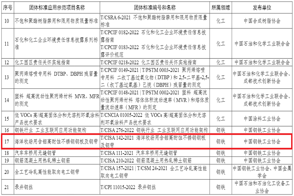 12月6日,中华人民共和国工业和信息化部通告,由青拓集团有限公司、冶金工业信息标准研究院等单位联合编制的T/CISA 142-2021《海洋牧场用含钼高耐蚀不锈钢钢板及钢带》中国钢铁工业协会团体标准荣获工业和信息化部2023年百项团体标准应用示范项目。
