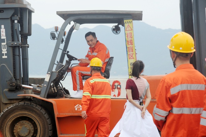 青拓物流5#、6#、7#码头在热烈气氛中盼来了主持人张蕾和嘉宾刘烨。门座式起重机拔地参天,货运轮船如海上堡垒,以白马河荡漾水波为背景,员工们身着工服簇拥着明星嘉宾,橙红鲜亮,深蓝沉稳,汇成色彩与歌声的海洋。放声高歌,振臂挥舞,以歌言梦,“奋斗才会有幸福,劳动最风流”,青拓人吹响时代号子;“富饶神州我的故乡,东西南北绚丽的舞台”,青拓人为新时代点赞!